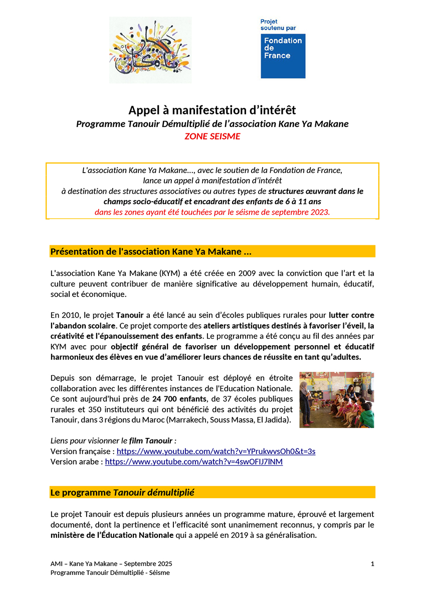 L’association Kane Ya Makane, avec le soutien de la Fondation de France, lance un appel à manifestation d’intérêt à destination des associations et structures socio-éducatives encadrant des enfants de 6 à 11 ans dans les zones touchées par le séisme de septembre 2023.